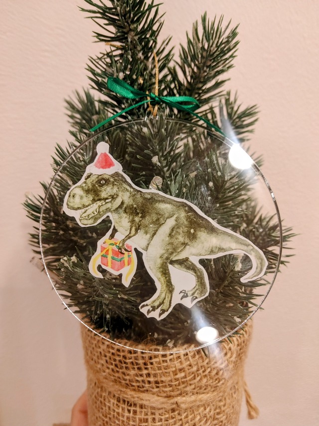 水彩絵具の分離色で描いた恐竜が、オーナメントになりました。 恐竜もクリスマス気分! 引っ掛け紐は金色で、クリスマスの雰囲気を盛り上げてくれます。 ツリー飾りに、お一つ仲間を増やしてみてはいかがでしょうか 画像1枚目。商品画像。ツリーは付きません 画像2枚目。こちらの絵を元に商品にしました。原画は付きません 送料・消費税込み価格 まとめてご購入希望の方はご購入前にメッセージを下さい。ご希望の商品で、まとめ割引のページを作ります。 返品不可 本体サイズ 10cm 素材 アクリル 制作 2023.11