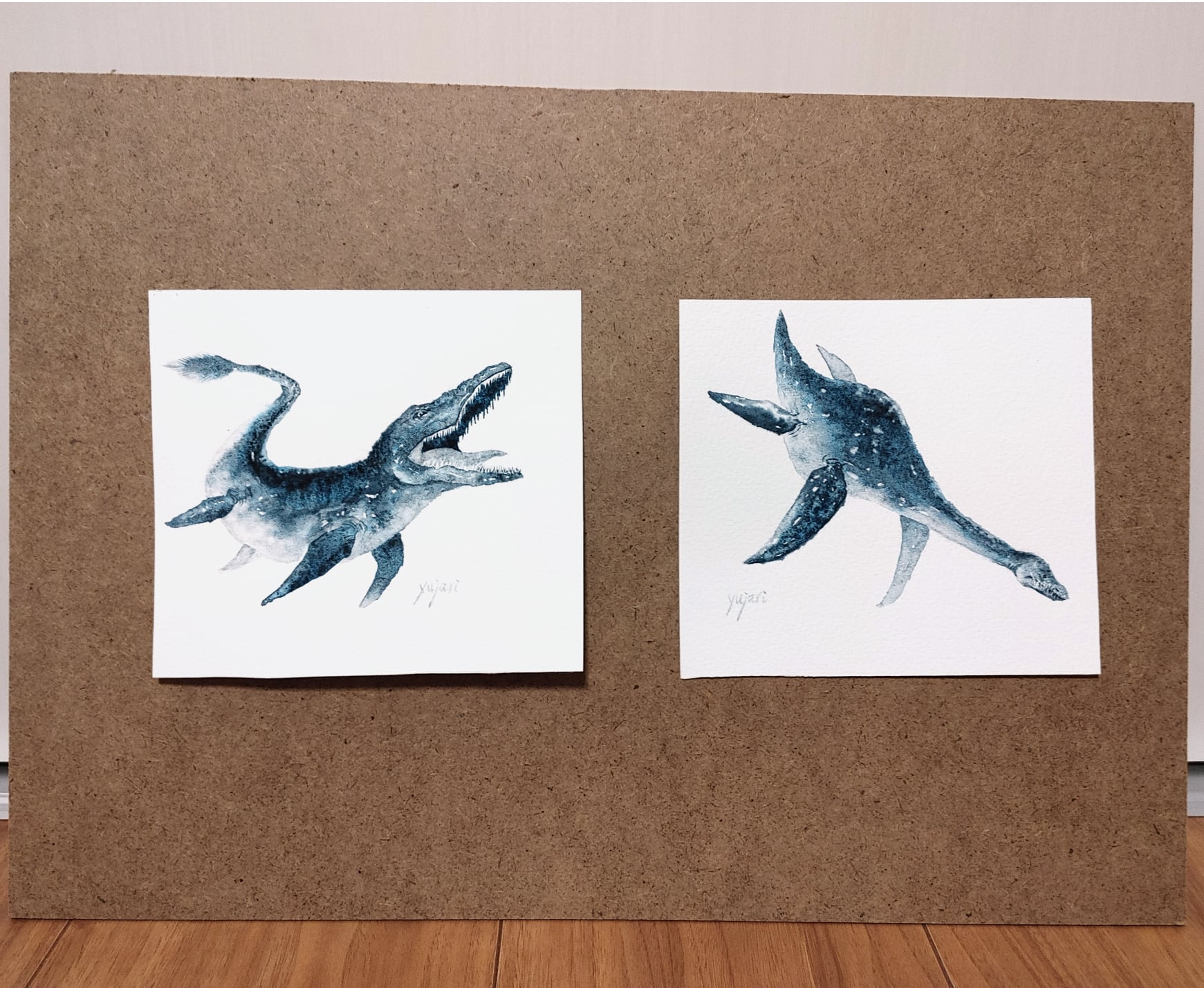分離色という絵具を1色だけ使って描いている恐竜シリーズです(画像2・3枚目)。