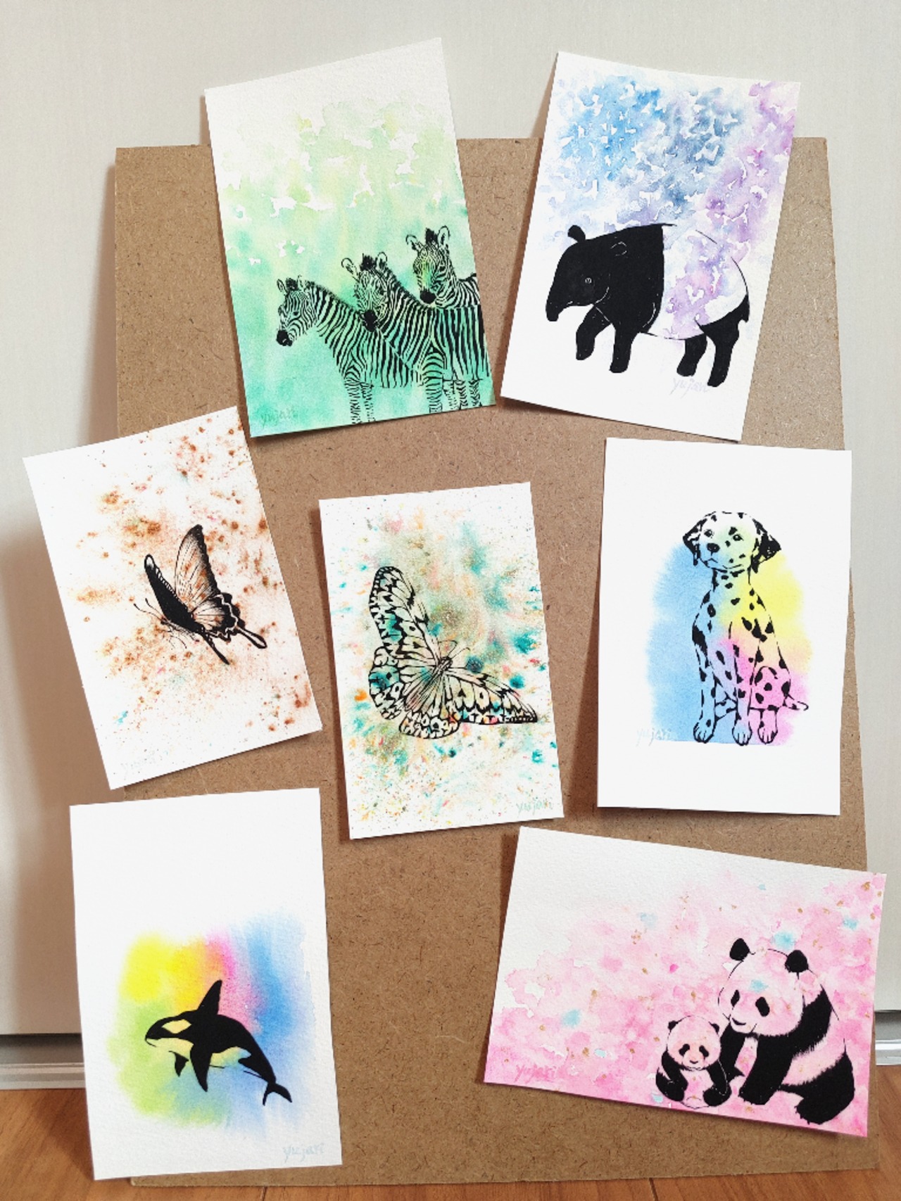 その動物でイメージした色の上に、黒だけで色黒の動物を表現したシリーズです(写真二枚目)