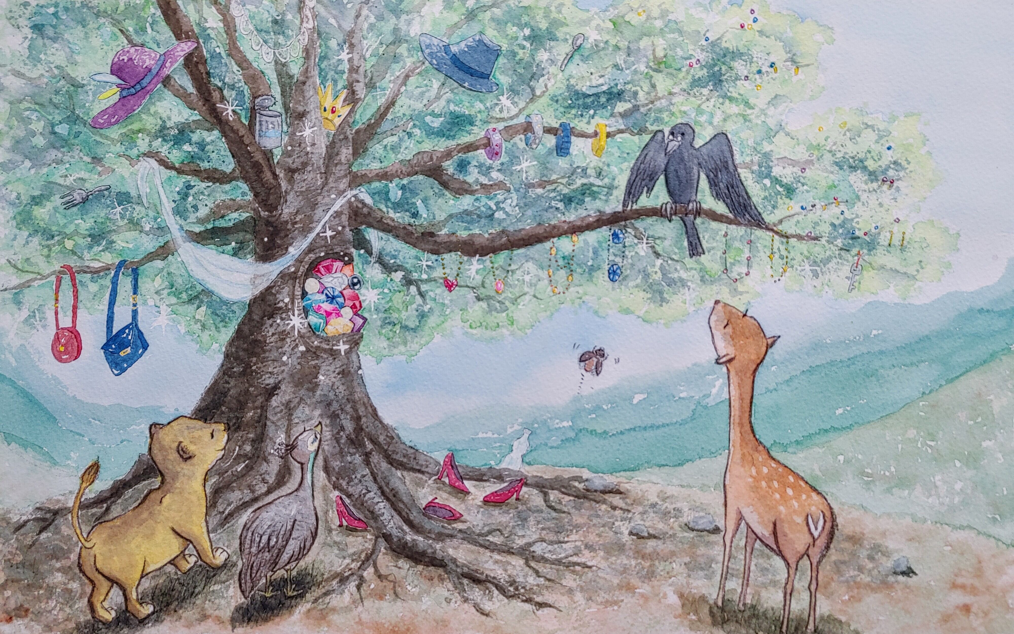 水彩で描かれたきらびやかな絵、可愛い動物。ちくはぐなかっこうをする動物さんたちをみながら、楽しく、自分らしさに気付いてもらえたらなと思いながら制作しました。