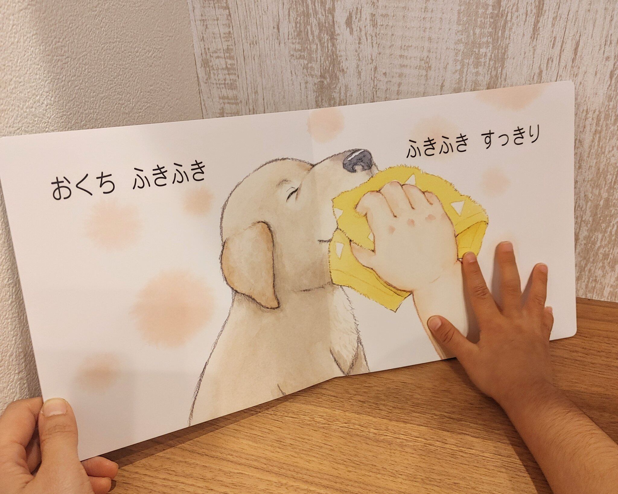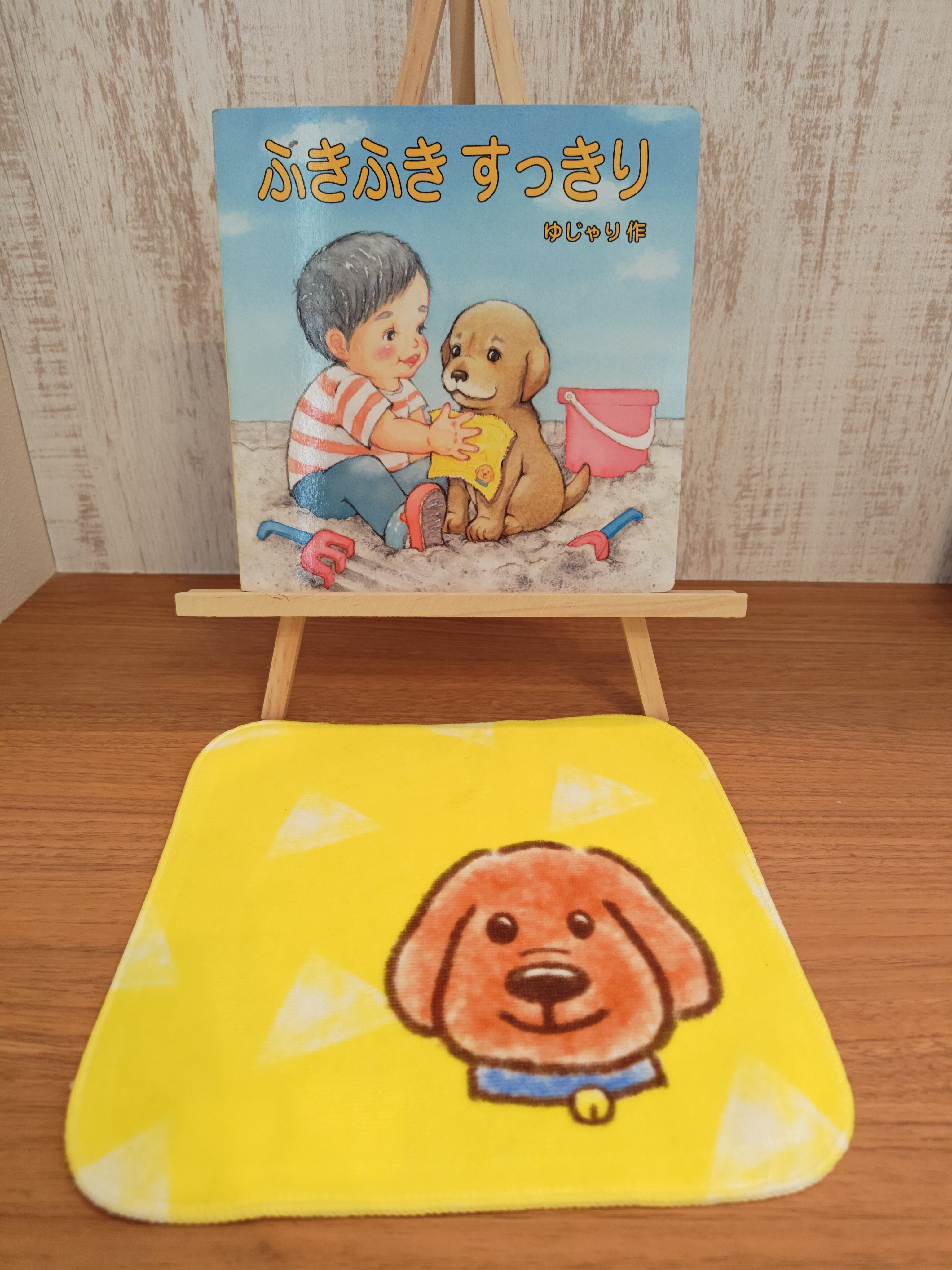 「ふきふきすっきり」サイン入り絵本。ふきふきしながら犬のお世話をしている気分になれる絵本です。絵本の真似っこをしながら習慣をみにつけよう。